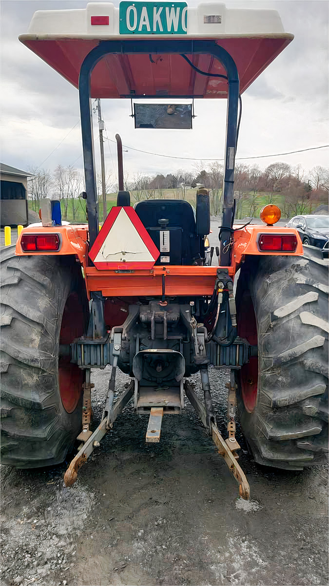 Estimated year 1995-1999 Kubota M5400 tractor-58 hp, 1813 hours, 12 speed transmission, front tires 20%; rear tires 40%; 1 set of hydraulic valves, rotating safety light; category 2 links. Weighs approximately 4100 pounds.